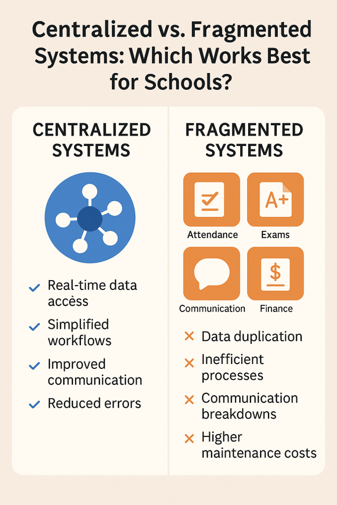 As schools evolve to meet modern demands, technology has become the foundation of efficient administration and learning management. But not all school systems are created equal. Many schools struggle to choose between centralized and fragmented management systems — two approaches that can dramatically impact daily operations, communication, and overall productivity.